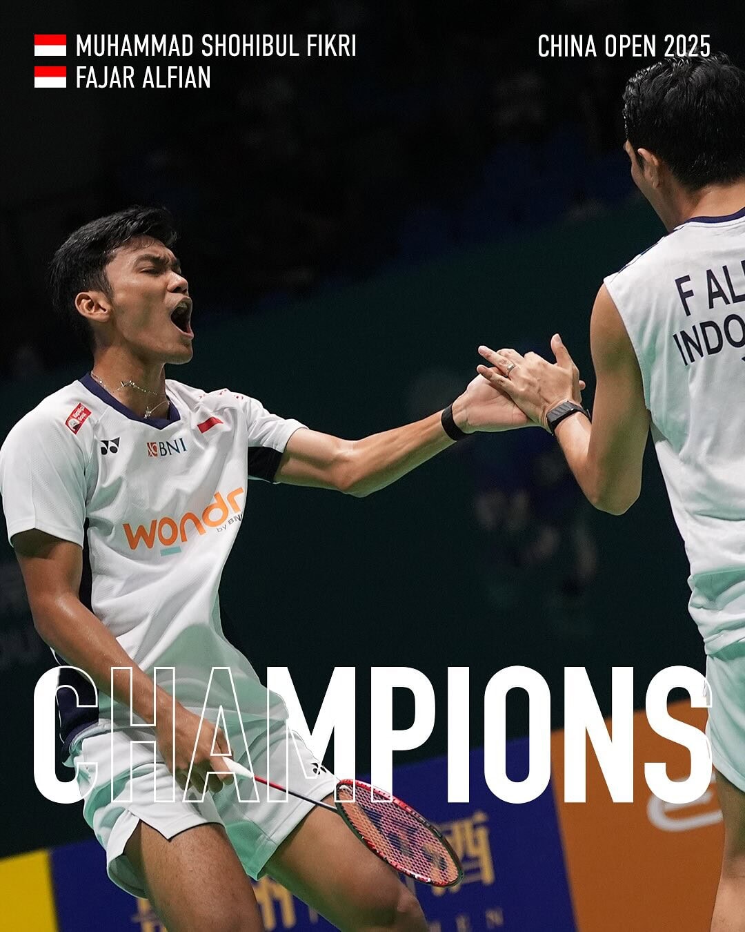 Фінал в чоловічій парній категорії став єдиним, де за титул змагались не представники Китаю: індонезійці Muhammad Fikri / Fajar Alfian грали проти малайзійців Aaron Chia / Soh Wooi Yik. Перемогу у двох геймах здобули спортсмени з Індонезії: 21-14, 21-15. Muhammad Fikri грає ракеткою Yonex Arcsaber 11 Pro.