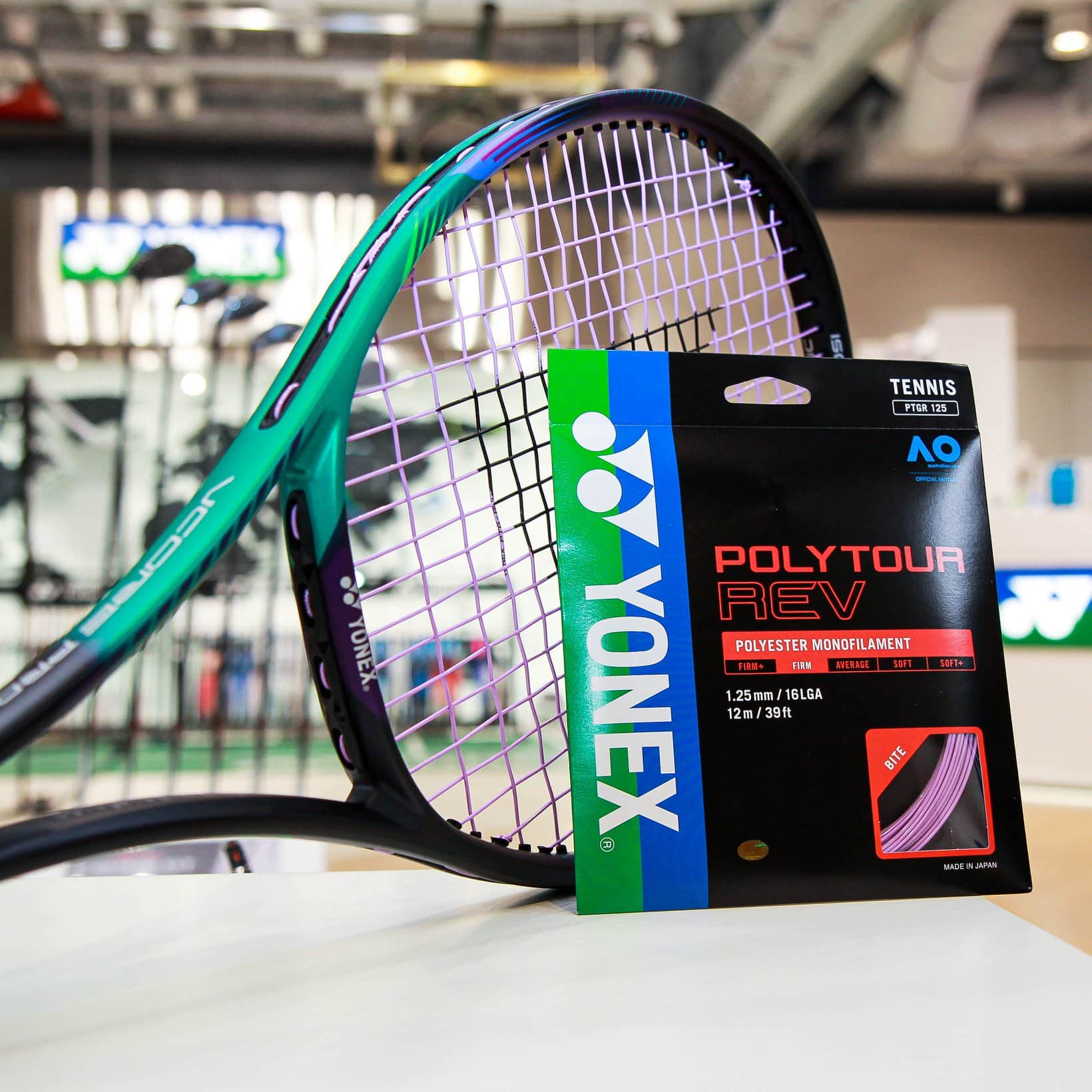 Polytour REV – новинка від Yonex, що вироблена з синтетичного моноволокна та має восьмигранну структуру. Зовнішня оболонка струни має силіконове покриття (Silicone Oil Infusion), що надає високий рівень «фідбеку» від ударів. Ця струна також забезпечує гарний рівень обертання, та чудово поєднується з ракетками серій Yonex Vcore або Vcore PRO.